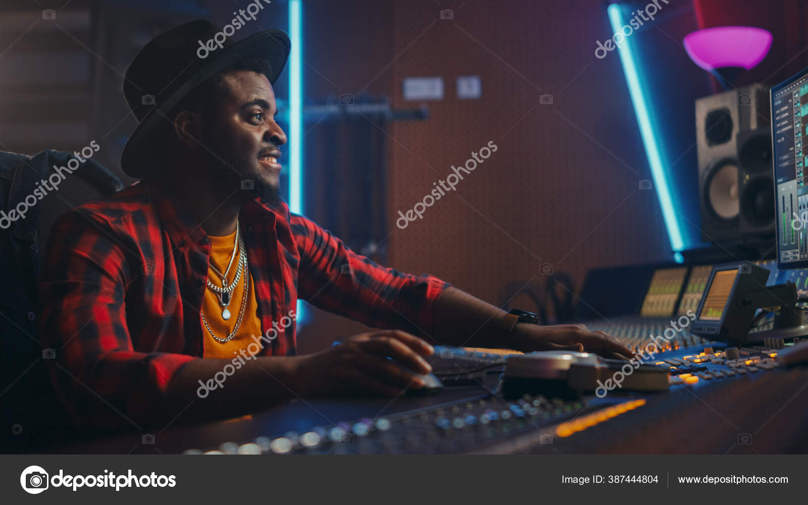 Stylish Audio Engineer Producer Working In Music Recording Studio Uses Mixing Board And Software To Create Modern Hit Song Black Artist Musician Using Control Desk To Produce New Song Stock Photo By C